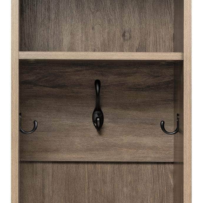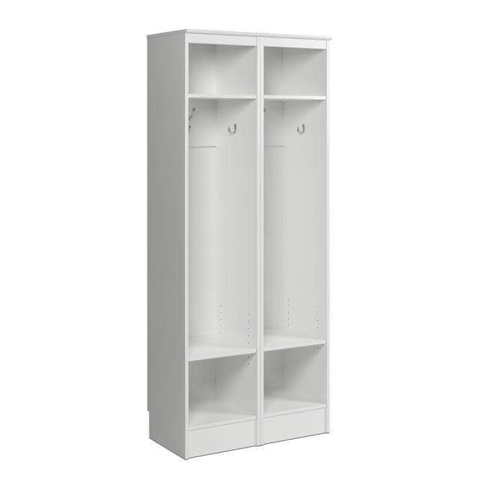The 2 piece Narrow Entryway Organizer Set is a great addition to any family room, recreation room or mudroom. Ideal for growing families, you can use organizers individually or position them side-by-side to create a built-in look. Each organizer is designed for maximum functionality. The tall compartment is 56.5" high and has a lower shelf that can be adjusted to eight different heights. One large double hook on the rear, reinforced panel and a single hook on each of the side panels allow ample room for hanging items. A fixed shelf on top with an 8" high compartment is spacious enough for decorative baskets, hats, and small bags.