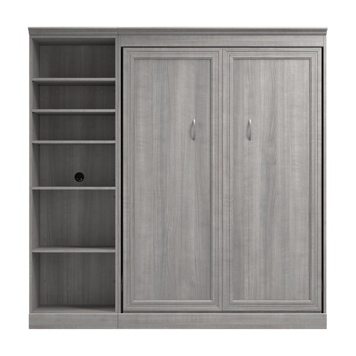 The Bestar Versatile Full Murphy Bed and Closet Organizer (84W) is the ideal space saver for a multipurpose room. The mattress support uses flexible slats that follow the curves of the body and absorb pressure for maximum comfort. The Full Murphy bed folds up and down smoothly thanks to the dual pistonne system. The wall bed can be used every night for a good night’s sleep. The bed accommodates most standard Full mattresses (8-10 inches thick, 60-90 lb, 54 x 75 inches) and supports up to 1000 lb (including mattress). The open bed extends 84. 9 inches from the wall. The cabinet must be anchored to a wall with a minimum ceiling height of 88. 8 inches. Allow a clearance of 30-36 inches around the open bed. Closet organizer comes with 2 fixed and 4 adjustable shelves to store your belongings. The dual-mount wall bed mechanism attaches to the floor and wall for maximum stability and durability. To avoid risk of injury, the Murphy bed must be installed to wall and floor structure by a professional or qualified person. Two people are required for assembly. Installation requires attachment to wood studs or masonry, removal of the baseboard, and drilling into the floor (if disassembly is required, holes may be covered with baseboards 0. 5 inches or thicker). All necessary hardware is included. Do not use this product for children or pets under 50 pounds (22. 7 kg). Backed by the Bestar 10 Year Manufacturer’s Warranty. North American made with globally sourced materials. The bed and cabinet must be anchored to a wall.