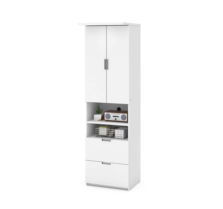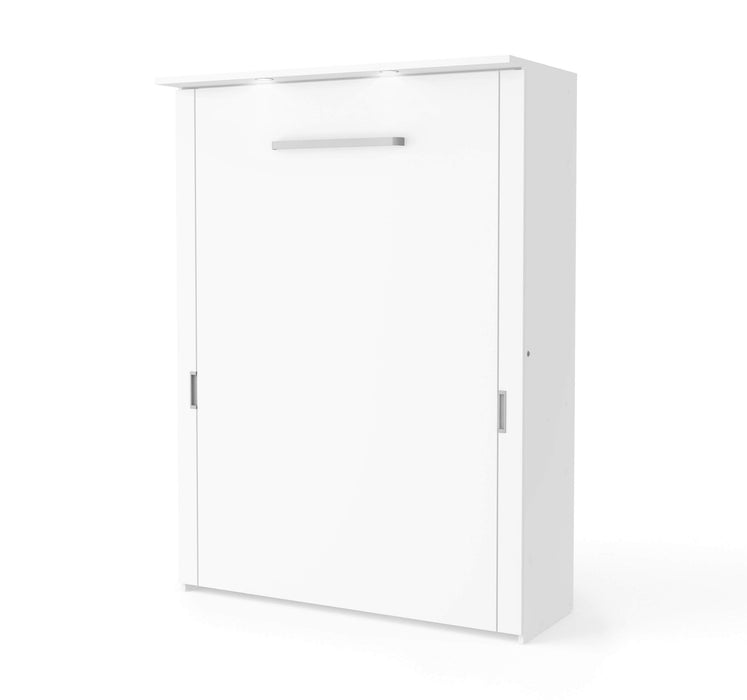 The Lumina collection is a brilliant way to optimize any space. It's the ideal solution when it comes to furnishing condos, lofts, guest rooms and offices! This kit comprises a Full Murphy Bed and one Storage Unit. Full Murphy bed: It features 2 LED lights for a functional and intimate effect. Brushed nickel handle and recessed pulls. The mechanism provides simplified assembly of the Murphy Bed. Increased comfort due to Euroslat mattress support system. Simple and safe dual piston system makes opening and closing user-friendly. Easy to use; use the handle to pull the bed towards you to lower the bed and flip the leg down onto the floor. Accommodates a standard full mattress up to 10" thick and weighing at least 70 lbs. The bed when opened will require a clearance of 88. 25" from the wall extending into the room. Bed must be secured to the wall into wood or metal studs. Mattress not included. Box spring not required. Storage Unit: It features 2 fixed shelves, 3 adjustable shelves and 2 drawers that slide out on smooth, full-extension ball-bearing slides. 1 LED light which provides ambient lighting. 1 grommet for wire management. Brushed nickel recessed pulls. Assembly required. Easy to install. The bed and cabinet must be anchored to a wall.