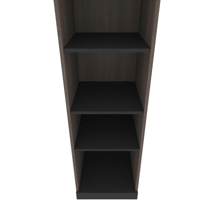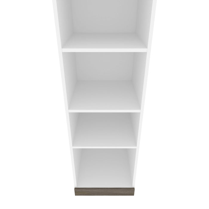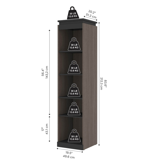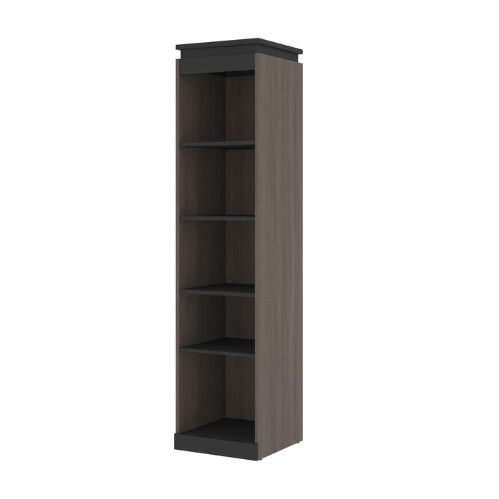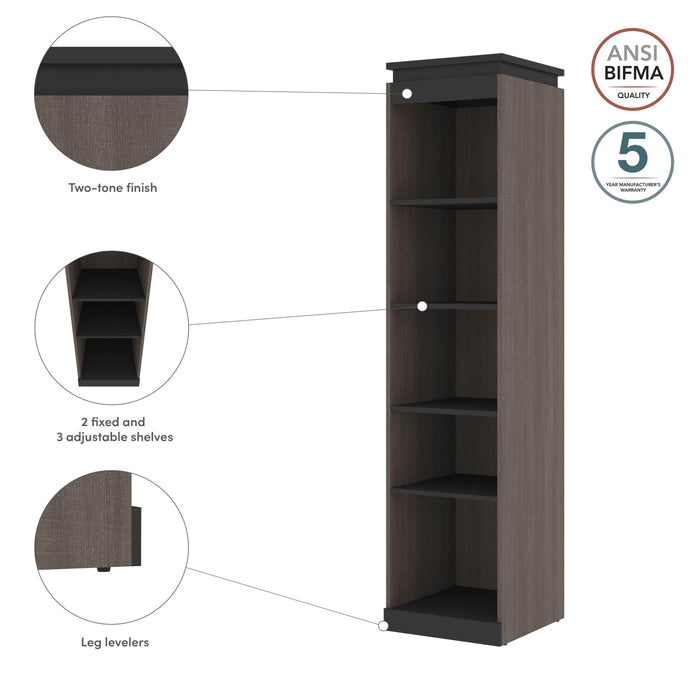 Keep your space organized with this Narrow Shelving Unit. With quality materials and 2 fixed shelves, this unit provides the utmost stability. The 3 adjustable shelves offer flexibility, allowing you to rearrange the unit to your liking. Each shelf can support up to 30 lb to keep your belongings safe. The elevated top is a unique design feature that adds flair to the Shelving Unit. The top has a weight capacity of up to 30 lb, meaning it can be used as an extra shelf. The unit coordinates beautifully with the Full or Queen Murphy Bed from the Orion collection (sold separately). Tested to meet ANSI/BIFMA quality standards for safety and performance.